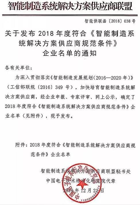 為加強智能制造系統解決方案供應商管理,深入貫徹落實《智能制造發展規劃(2016—2020年)》(工信部聯規〔2016〕349號),中國智能制造系統解決方案供應商聯盟組織開展符合《智能制造系統解決方案供應商規范條件》的企業申報工作,經專業評審、網上公示,最終全國范圍共評選出82家知名企業,山東省共8家企業入選。